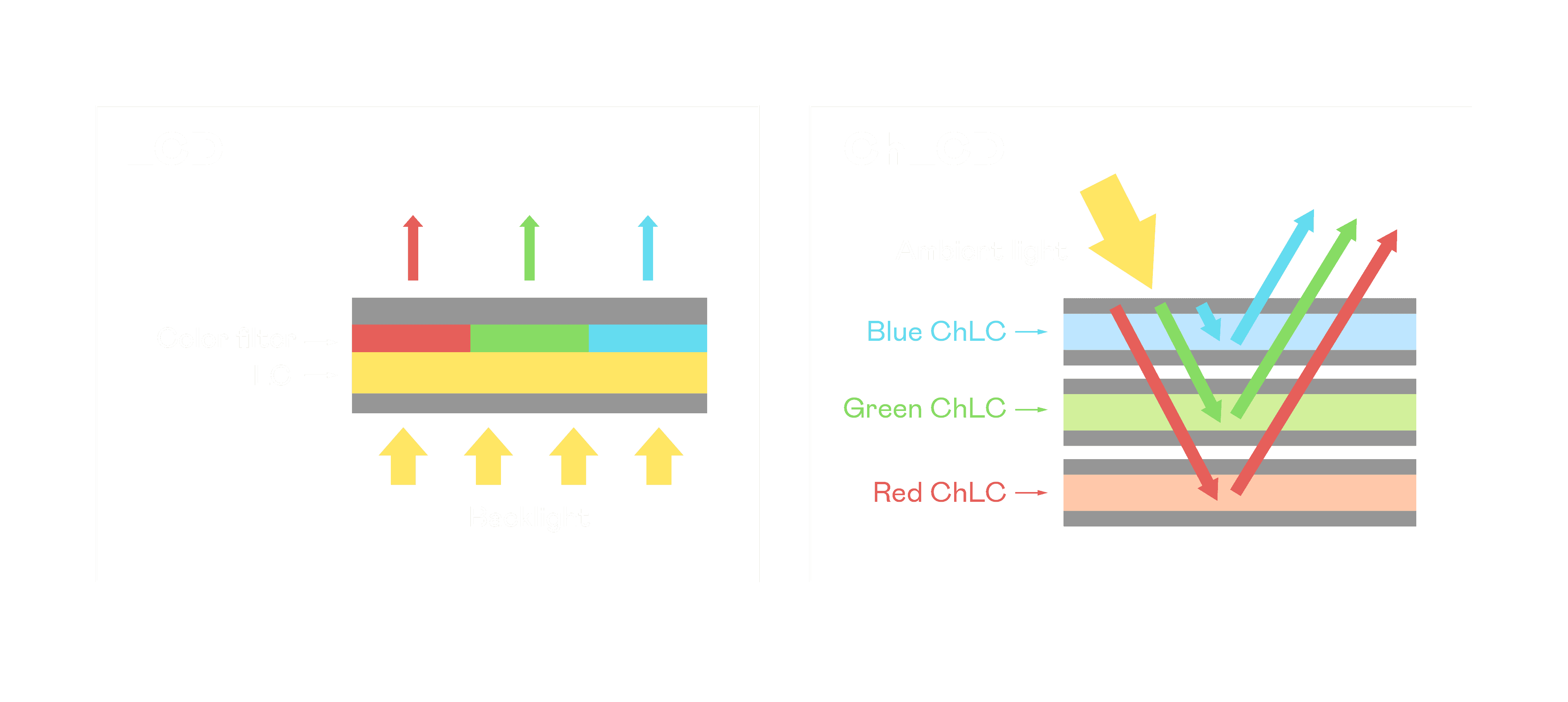 ChLCD 胆固醇液晶就如同纸张一样,,透过反射环境光来显示影像,,,,因此长时间观看不易造成人眼视觉疲劳,,,可达到护眼效果。。当处于户外阳光下使用,,LCD 影像容易失真而不易观看,,,但胆固醇液晶仍可维持较佳的影像品质。。。