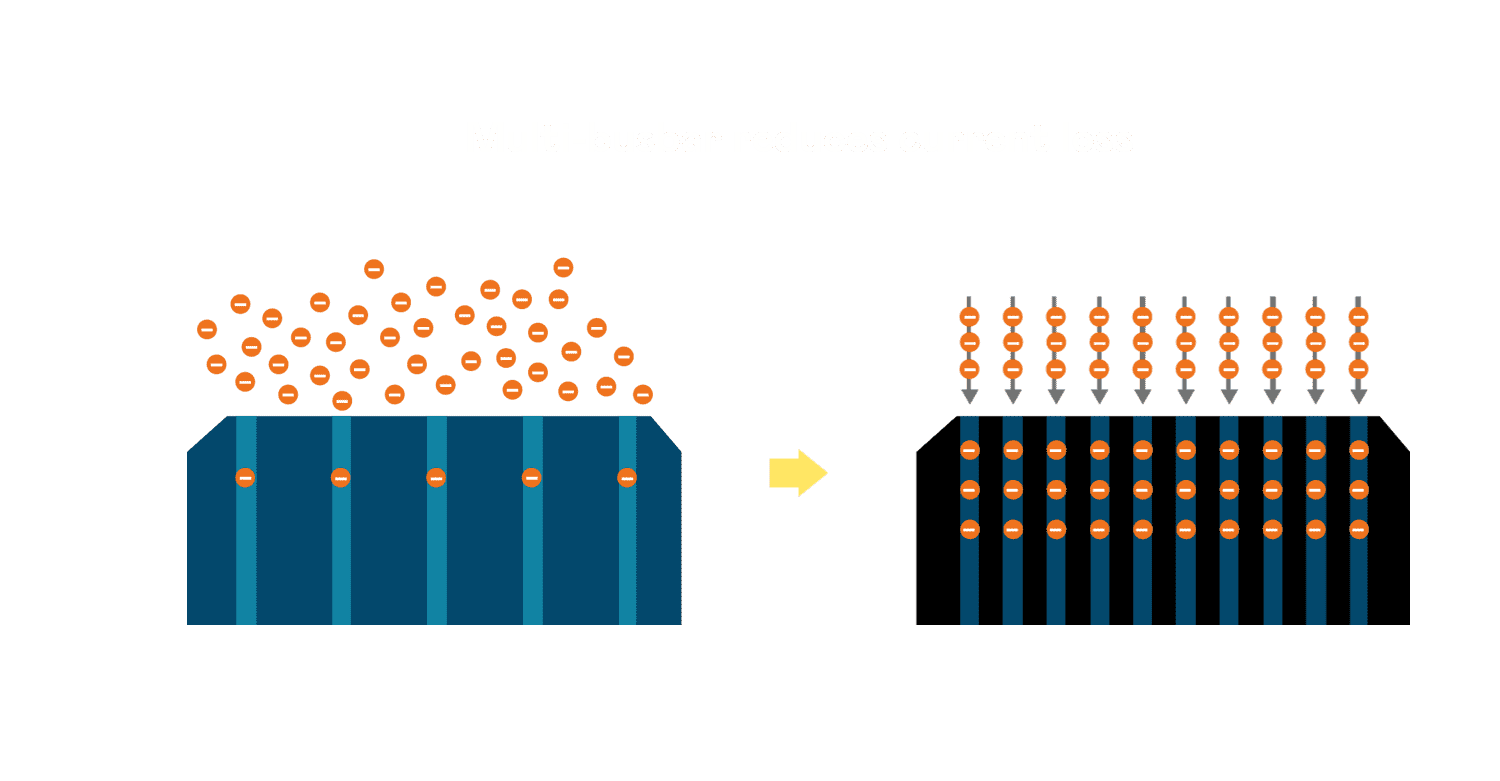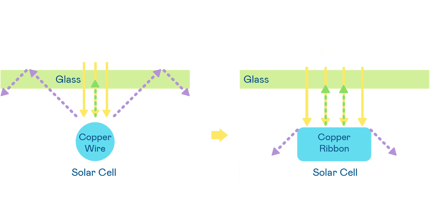 - 电池使用多条铜导线 (Copper wire) 于电池片上形成较短的电流路径,,,提高电流收集效率,,采用圆形设计的铜导线较传统扁平式的铜焊带 (Ribbon),,可增加入射至电池的光线量。。。